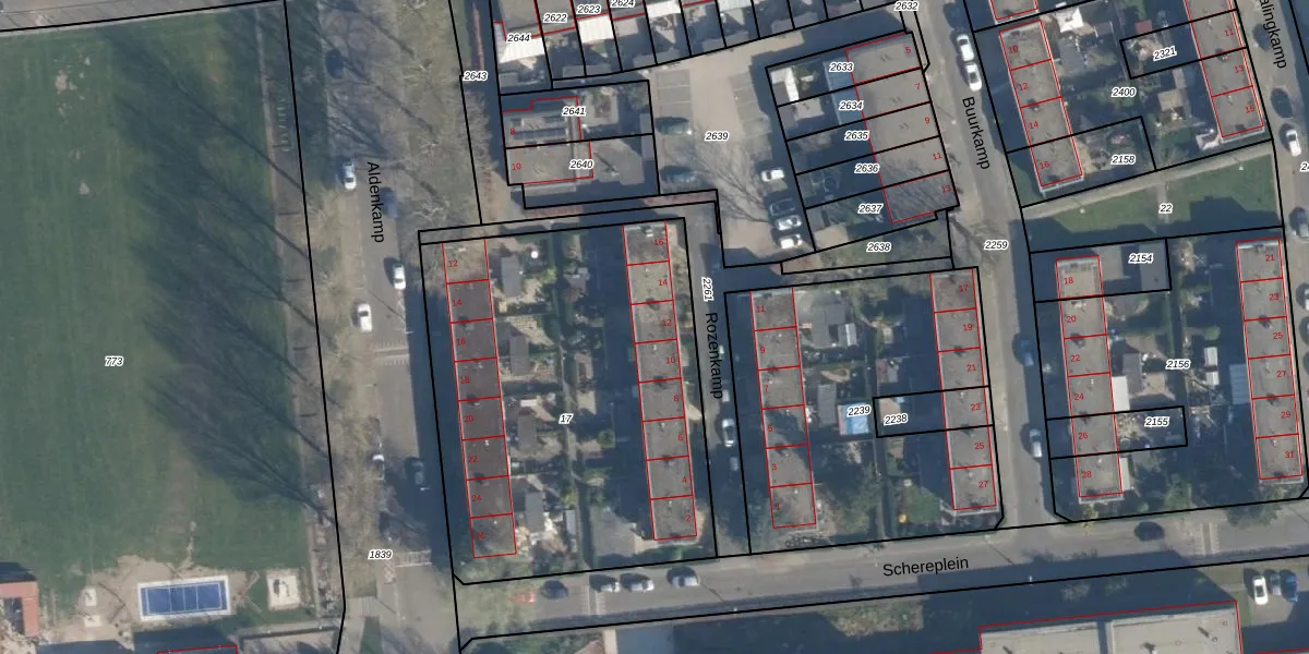 Het perceel waarop Rozenkamp 12 staat heeft een oppervlakte van 2114 m². Dit is een zeer groot perceel. De perceeloppervlakte wordt geregistreerd door het Kadaster. Gedetailleerde informatie over de maten van dit perceel kunt u vinden in het rapport Kadastrale kaart met maatvoering van Rozenkamp 12.