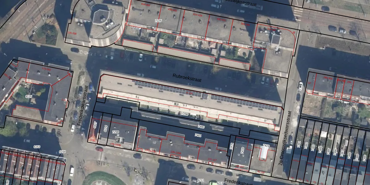 Rubroekstraat 108 is gelegen op kadastraal perceel RTD07R7296. Deze kadastrale aanduiding is uniek en wordt gebruikt door het Kadaster om eigendomsrechten en andere zakelijke rechten vast te leggen. Het perceel maakt onderdeel uit van de kadastrale gemeente Rotterdam.
