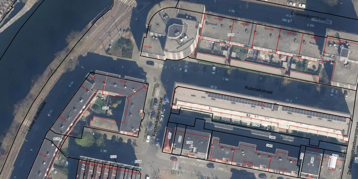 Rubroekstraat 124 is gelegen op kadastraal perceel RTD07R7296. Deze kadastrale aanduiding is uniek en wordt gebruikt door het Kadaster om eigendomsrechten en andere zakelijke rechten vast te leggen. Het perceel maakt onderdeel uit van de kadastrale gemeente Rotterdam.