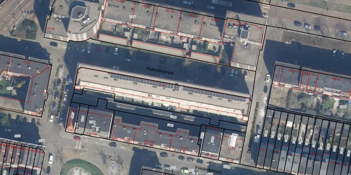 Het perceel waarop het adres ligt is RTD07-R-7296. De afkorting 'RTD07' staat voor kadastrale gemeente Rotterdam. De gemiddelde perceeloppervlakte in de kadastrale gemeente Rotterdam is 506,86 m². Dit perceel is met zijn 1495 m² dus groter dan gemiddeld. Het grootste perceel in de kadastrale gemeente is 10,8 ha. Het kleinste perceel heeft een oppervlakte van 0 m². Op het perceel zijn 61 adressen aanwezig. De laatste wijziging in het de Basisregistratie Kadaster (BRK) was op 06-12-2002.