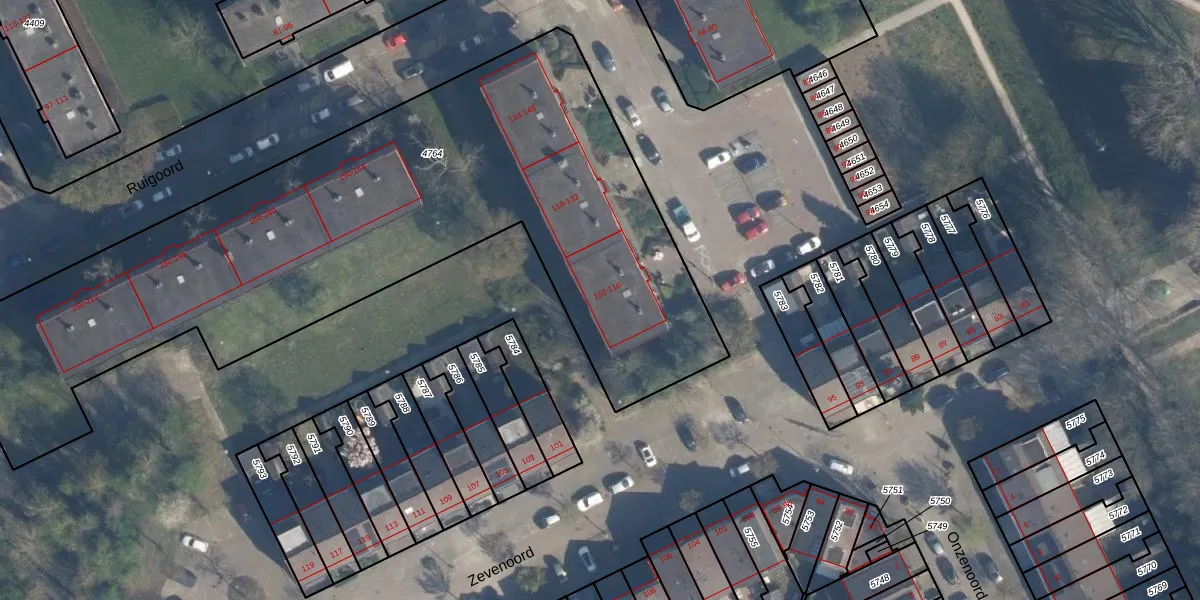 Het perceel waarop Ruigoord 116 staat heeft een oppervlakte van 3614 m². Dit is een zeer groot perceel. De perceeloppervlakte wordt geregistreerd door het Kadaster. Gedetailleerde informatie over de maten van dit perceel kunt u vinden in het rapport Kadastrale kaart met maatvoering van Ruigoord 116.