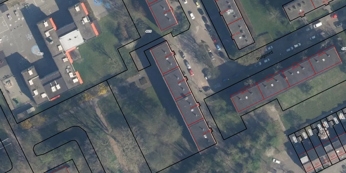 Het perceel waarop Ruigoord 258 staat heeft een oppervlakte van 4397 m². Dit is een zeer groot perceel. De perceeloppervlakte wordt geregistreerd door het Kadaster. Gedetailleerde informatie over de maten van dit perceel kunt u vinden in het rapport Kadastrale kaart met maatvoering van Ruigoord 258.