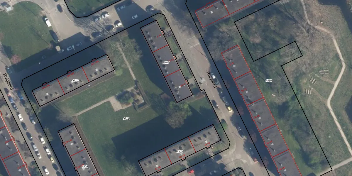 Het perceel waarop Ruigoord 45 staat heeft een oppervlakte van 481 m². Dit is een groot perceel. De perceeloppervlakte wordt geregistreerd door het Kadaster. Gedetailleerde informatie over de maten van dit perceel kunt u vinden in het rapport Kadastrale kaart met maatvoering van Ruigoord 45.