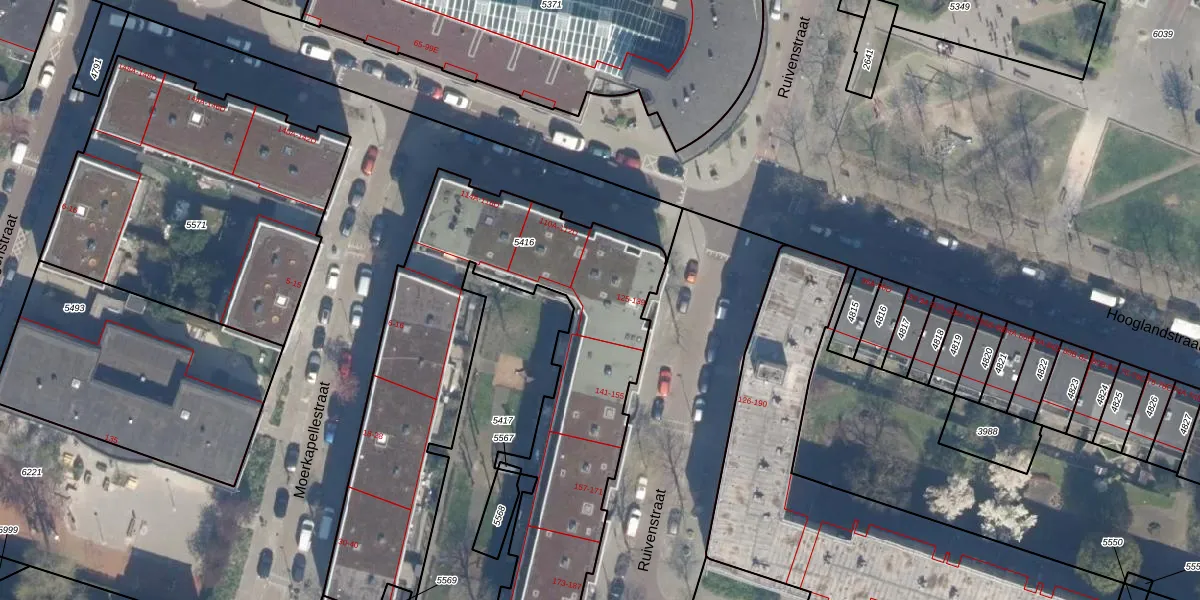 Het perceel waarop Ruivenstraat 131 staat heeft een oppervlakte van 2365 m². Dit is een zeer groot perceel. De perceeloppervlakte wordt geregistreerd door het Kadaster. Gedetailleerde informatie over de maten van dit perceel kunt u vinden in het rapport Kadastrale kaart met maatvoering van Ruivenstraat 131.
