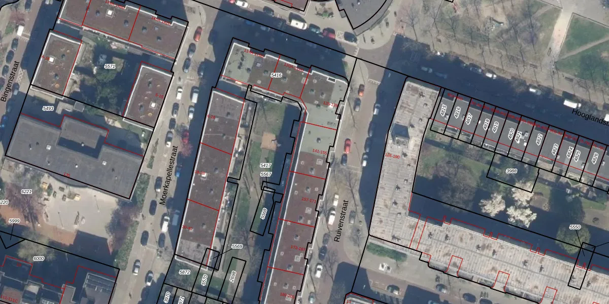 Het perceel waarop het adres ligt is RTD07-W-5416. De afkorting 'RTD07' staat voor kadastrale gemeente Rotterdam. De oppervlakte van het perceel is 2365 m². Dat is groter dan gemiddeld in Rotterdam, waar de gemiddelde perceeloppervlakte op 506,86 m² ligt. De grootste perceeloppervlakte in de kadastrale gemeente is 10,8 ha. De kleinste oppervlakte bedraagt 0 m². Op het perceel zijn 74 adressen aanwezig. In de Basisregistratie Kadaster (BRK) werden de grenzen van het perceel geregistreerd op 17-01-2007.