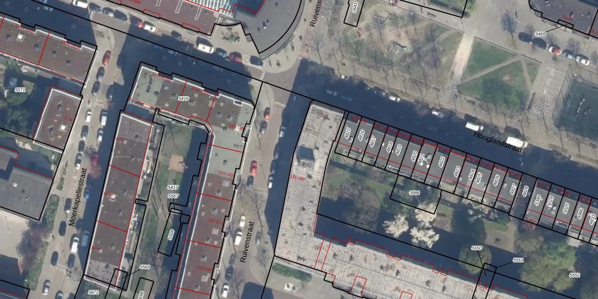 Ruivenstraat 164 is gelegen op kadastraal perceel RTD07W5549. Deze kadastrale aanduiding is uniek en wordt gebruikt door het Kadaster om eigendomsrechten en andere zakelijke rechten vast te leggen. Het perceel maakt onderdeel uit van de kadastrale gemeente Rotterdam.