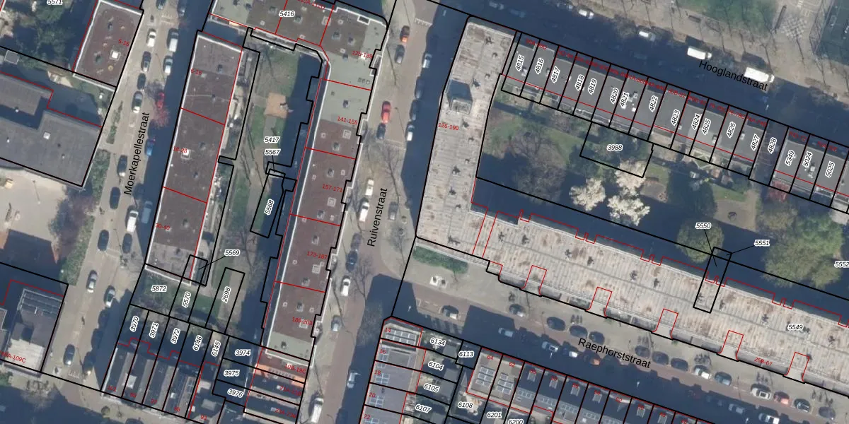 Ruivenstraat 190 is gelegen op kadastraal perceel RTD07W5549. Deze kadastrale aanduiding is uniek en wordt gebruikt door het Kadaster om eigendomsrechten en andere zakelijke rechten vast te leggen. Het perceel maakt onderdeel uit van de kadastrale gemeente Rotterdam.