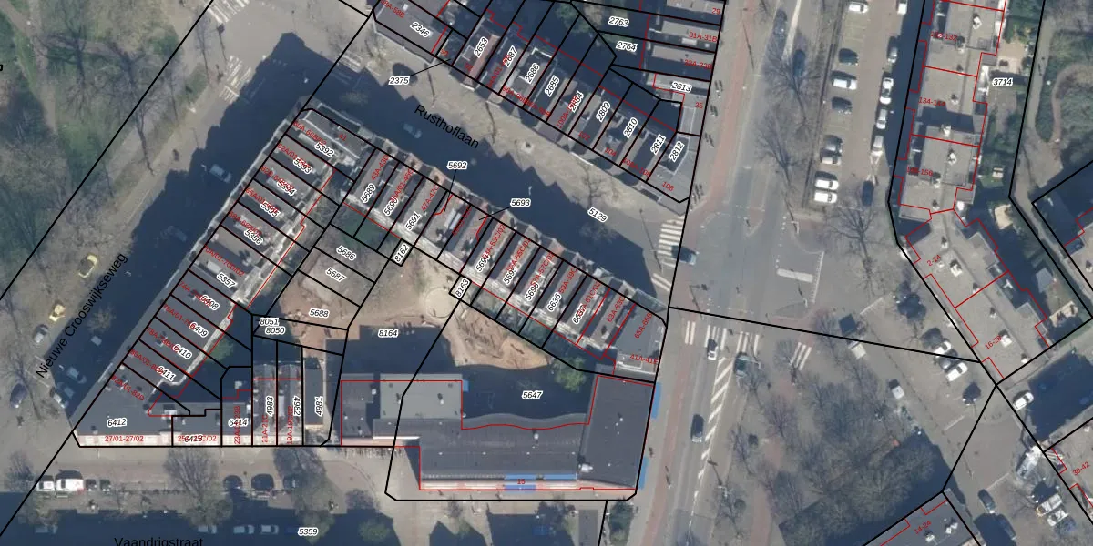 Het perceel waarop Rusthoflaan 57-C-01 staat heeft een oppervlakte van 81 m². Dit is een klein perceel. De perceeloppervlakte wordt geregistreerd door het Kadaster. Gedetailleerde informatie over de maten van dit perceel kunt u vinden in het rapport Kadastrale kaart met maatvoering van Rusthoflaan 57-C-01.