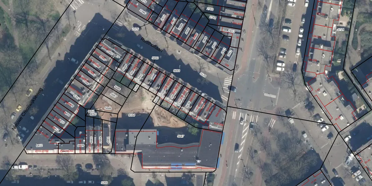 Het perceel waarop Rusthoflaan 57-C staat heeft een oppervlakte van 81 m². Dit is een klein perceel. De perceeloppervlakte wordt geregistreerd door het Kadaster. Gedetailleerde informatie over de maten van dit perceel kunt u vinden in het rapport Kadastrale kaart met maatvoering van Rusthoflaan 57-C.