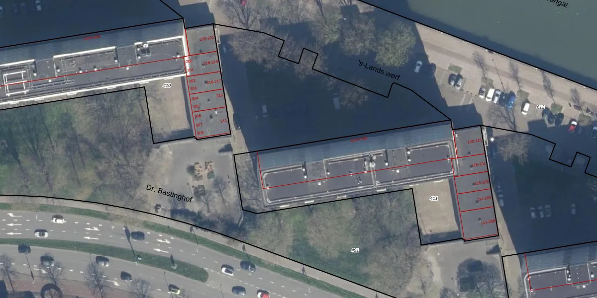 's-Lands werf 186 is gelegen op kadastraal perceel KLG00I411. Deze kadastrale aanduiding is uniek en wordt gebruikt door het Kadaster om eigendomsrechten en andere zakelijke rechten vast te leggen. Het perceel maakt onderdeel uit van de kadastrale gemeente Kralingen.