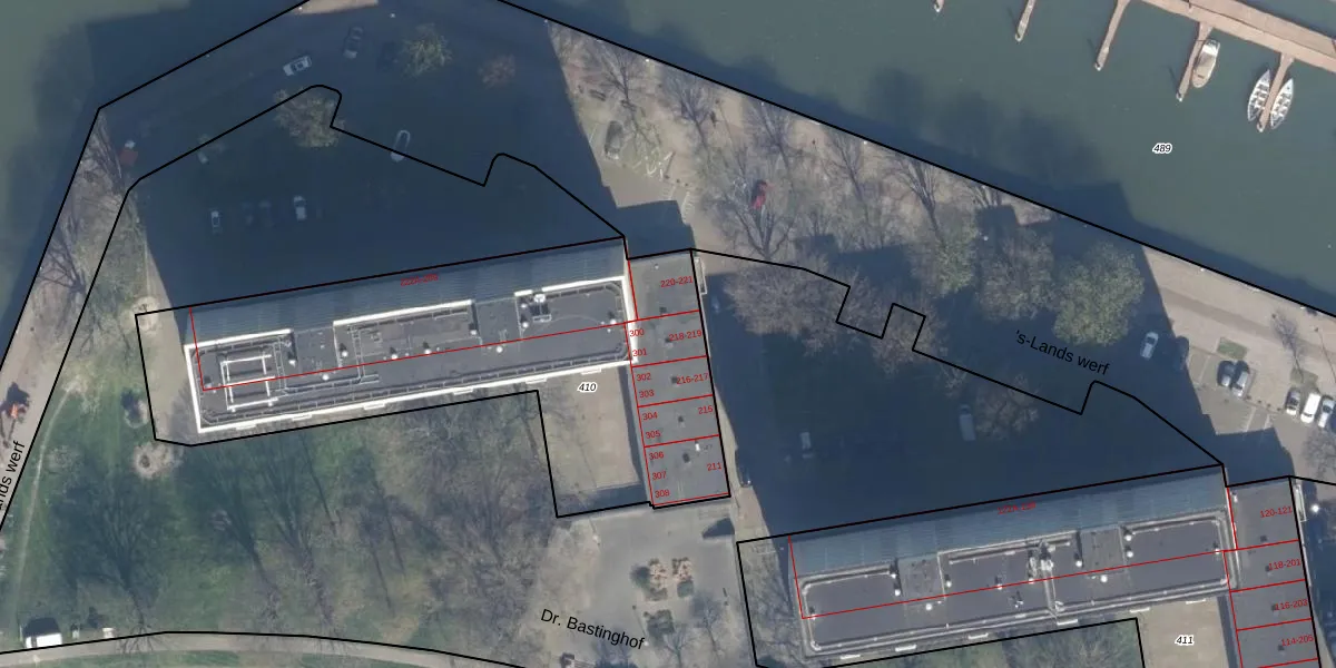 Het perceel waarop 's-Lands werf 219 staat heeft een oppervlakte van 2200 m². Dit is een zeer groot perceel. De perceeloppervlakte wordt geregistreerd door het Kadaster. Gedetailleerde informatie over de maten van dit perceel kunt u vinden in het rapport Kadastrale kaart met maatvoering van 's-Lands werf 219.