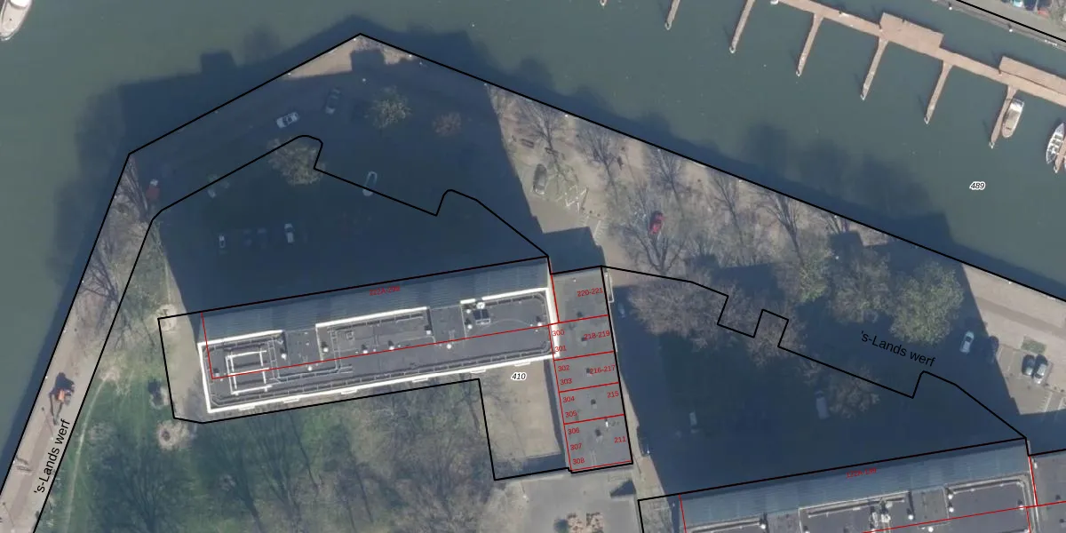 Het perceel waarop 's-Lands werf 222-A staat heeft een oppervlakte van 2200 m². Dit is een zeer groot perceel. De perceeloppervlakte wordt geregistreerd door het Kadaster. Gedetailleerde informatie over de maten van dit perceel kunt u vinden in het rapport Kadastrale kaart met maatvoering van 's-Lands werf 222-A.