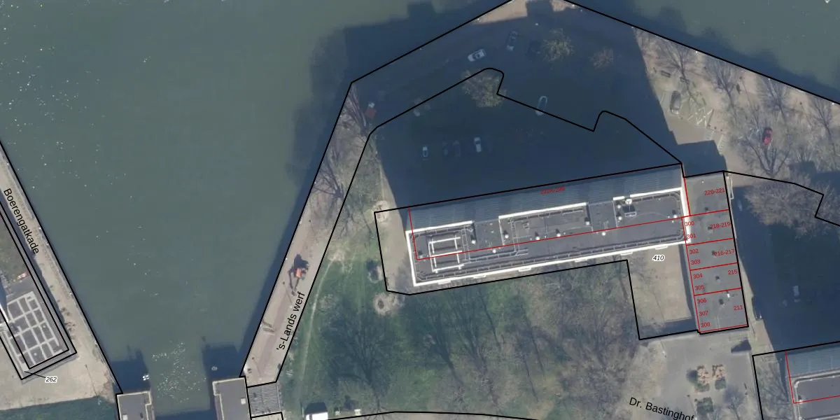 Het perceel waarop 's-Lands werf 288-B staat heeft een oppervlakte van 2200 m². Dit is een zeer groot perceel. De perceeloppervlakte wordt geregistreerd door het Kadaster. Gedetailleerde informatie over de maten van dit perceel kunt u vinden in het rapport Kadastrale kaart met maatvoering van 's-Lands werf 288-B.