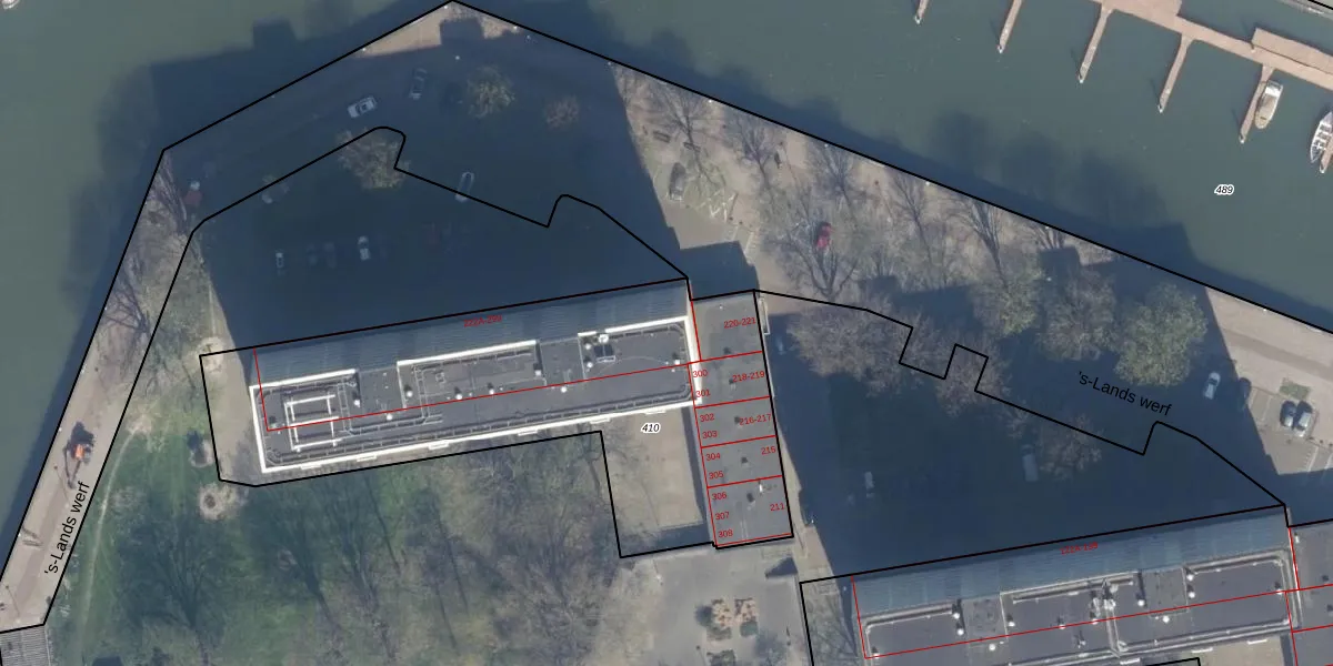 Het perceel waarop 's-Lands werf 298 staat heeft een oppervlakte van 2200 m². Dit is een zeer groot perceel. De perceeloppervlakte wordt geregistreerd door het Kadaster. Gedetailleerde informatie over de maten van dit perceel kunt u vinden in het rapport Kadastrale kaart met maatvoering van 's-Lands werf 298.