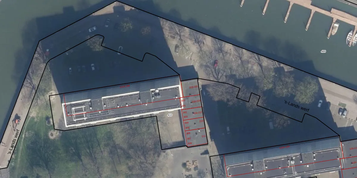 Het perceel waarop 's-Lands werf 299 staat heeft een oppervlakte van 2200 m². Dit is een zeer groot perceel. De perceeloppervlakte wordt geregistreerd door het Kadaster. Gedetailleerde informatie over de maten van dit perceel kunt u vinden in het rapport Kadastrale kaart met maatvoering van 's-Lands werf 299.