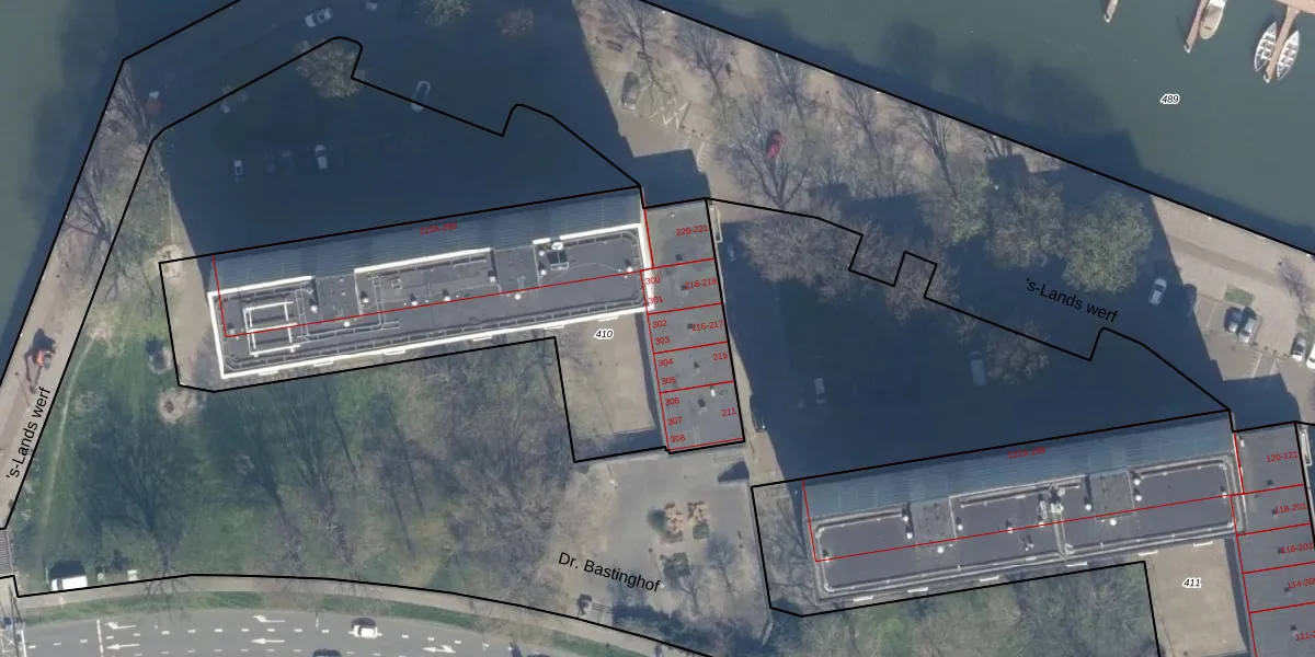 Het perceel waarop 's-Lands werf 302 staat heeft een oppervlakte van 2200 m². Dit is een zeer groot perceel. De perceeloppervlakte wordt geregistreerd door het Kadaster. Gedetailleerde informatie over de maten van dit perceel kunt u vinden in het rapport Kadastrale kaart met maatvoering van 's-Lands werf 302.