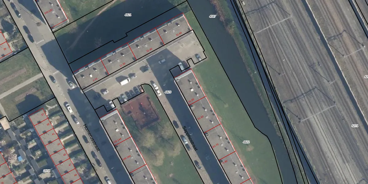 Het perceel waarop Sapphostraat 45 staat heeft een oppervlakte van 7525 m². Dit is een zeer groot perceel. De perceeloppervlakte wordt geregistreerd door het Kadaster. Gedetailleerde informatie over de maten van dit perceel kunt u vinden in het rapport Kadastrale kaart met maatvoering van Sapphostraat 45.