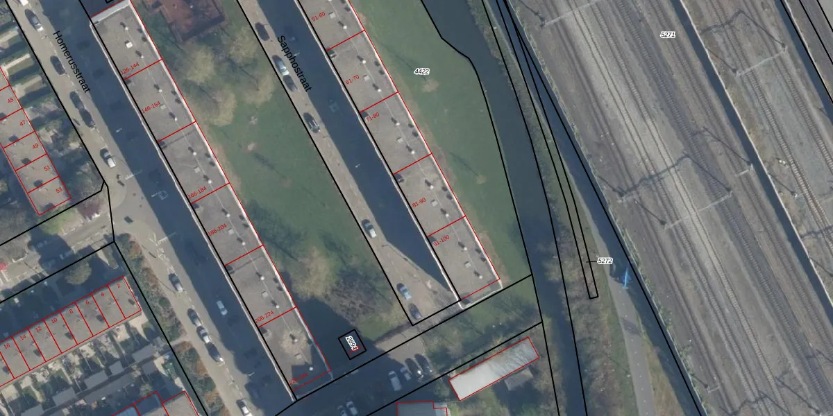 Het perceel waarop Sapphostraat 82 staat heeft een oppervlakte van 7525 m². Dit is een zeer groot perceel. De perceeloppervlakte wordt geregistreerd door het Kadaster. Gedetailleerde informatie over de maten van dit perceel kunt u vinden in het rapport Kadastrale kaart met maatvoering van Sapphostraat 82.