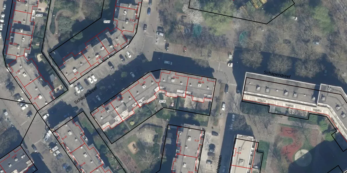 Schapendreef 43 is gelegen op kadastraal perceel KLG00C3716. Deze kadastrale aanduiding is uniek en wordt gebruikt door het Kadaster om eigendomsrechten en andere zakelijke rechten vast te leggen. Het perceel maakt onderdeel uit van de kadastrale gemeente Kralingen.