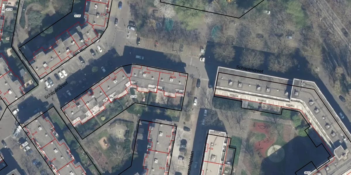Schapendreef 57 is gelegen op kadastraal perceel KLG00C3716. Deze kadastrale aanduiding is uniek en wordt gebruikt door het Kadaster om eigendomsrechten en andere zakelijke rechten vast te leggen. Het perceel maakt onderdeel uit van de kadastrale gemeente Kralingen.