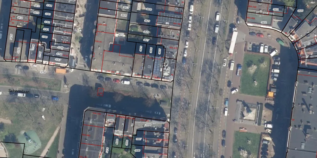 Schermlaan 3-B is gelegen op kadastraal perceel DHV00C3825. Deze kadastrale aanduiding is uniek en wordt gebruikt door het Kadaster om eigendomsrechten en andere zakelijke rechten vast te leggen. Het perceel maakt onderdeel uit van de kadastrale gemeente Delfshaven.