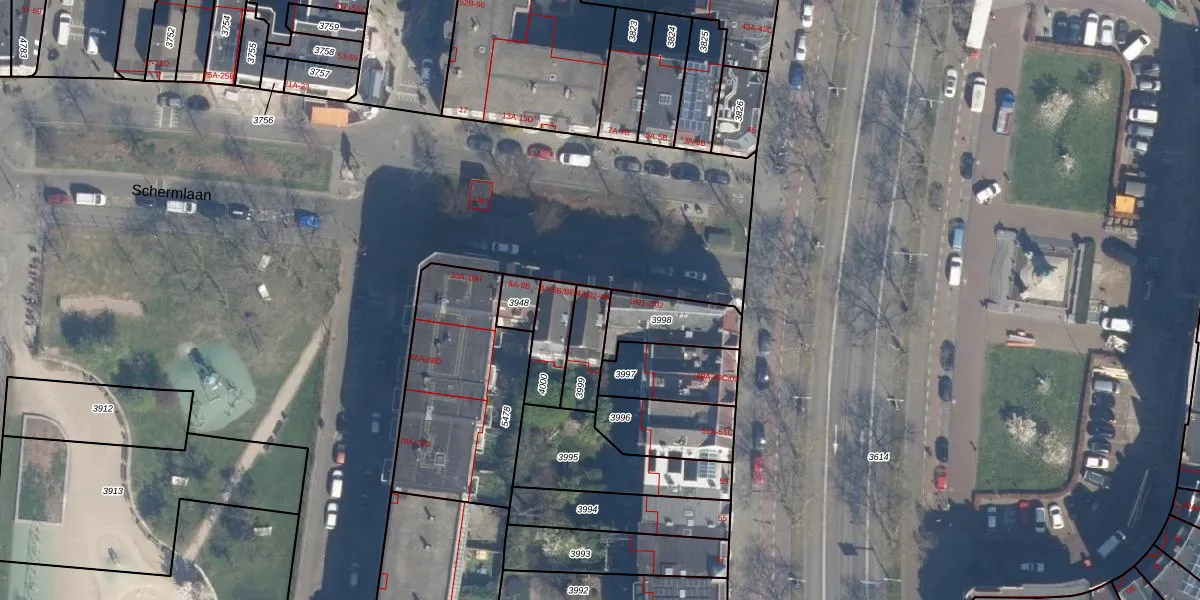 Schermlaan 4-B is gelegen op kadastraal perceel DHV00C3999. Deze kadastrale aanduiding is uniek en wordt gebruikt door het Kadaster om eigendomsrechten en andere zakelijke rechten vast te leggen. Het perceel maakt onderdeel uit van de kadastrale gemeente Delfshaven.