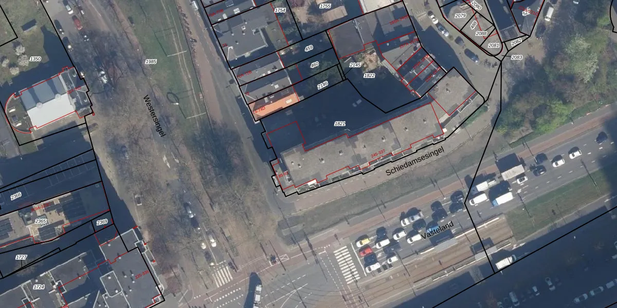 Het perceel waarop Schiedamsesingel 291 staat heeft een oppervlakte van 1545 m². Dit is een zeer groot perceel. De perceeloppervlakte wordt geregistreerd door het Kadaster. Gedetailleerde informatie over de maten van dit perceel kunt u vinden in het rapport Kadastrale kaart met maatvoering van Schiedamsesingel 291.