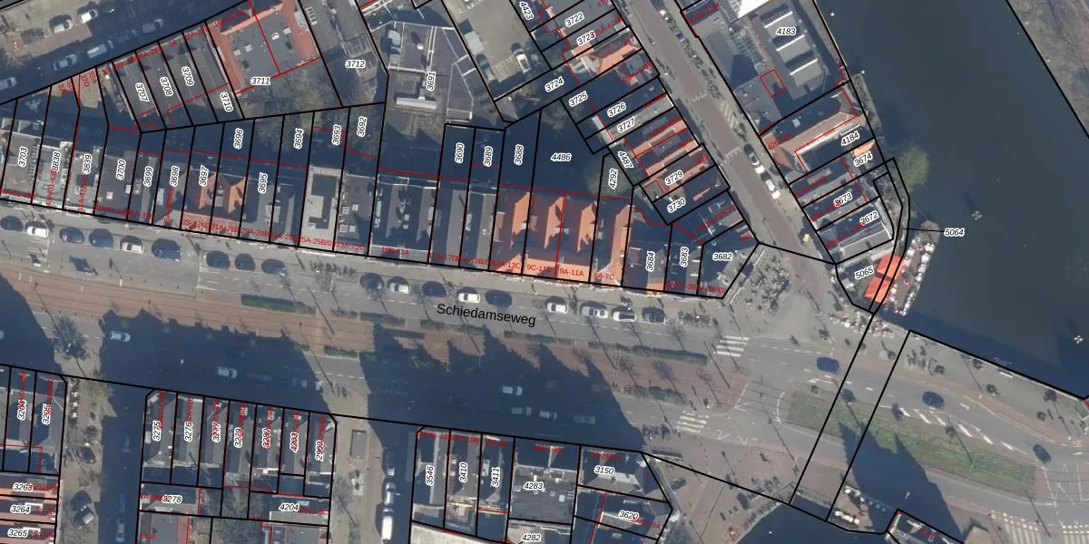 Schiedamseweg 11-C is gelegen op kadastraal perceel DHV00H4486. Deze kadastrale aanduiding is uniek en wordt gebruikt door het Kadaster om eigendomsrechten en andere zakelijke rechten vast te leggen. Het perceel maakt onderdeel uit van de kadastrale gemeente Delfshaven.