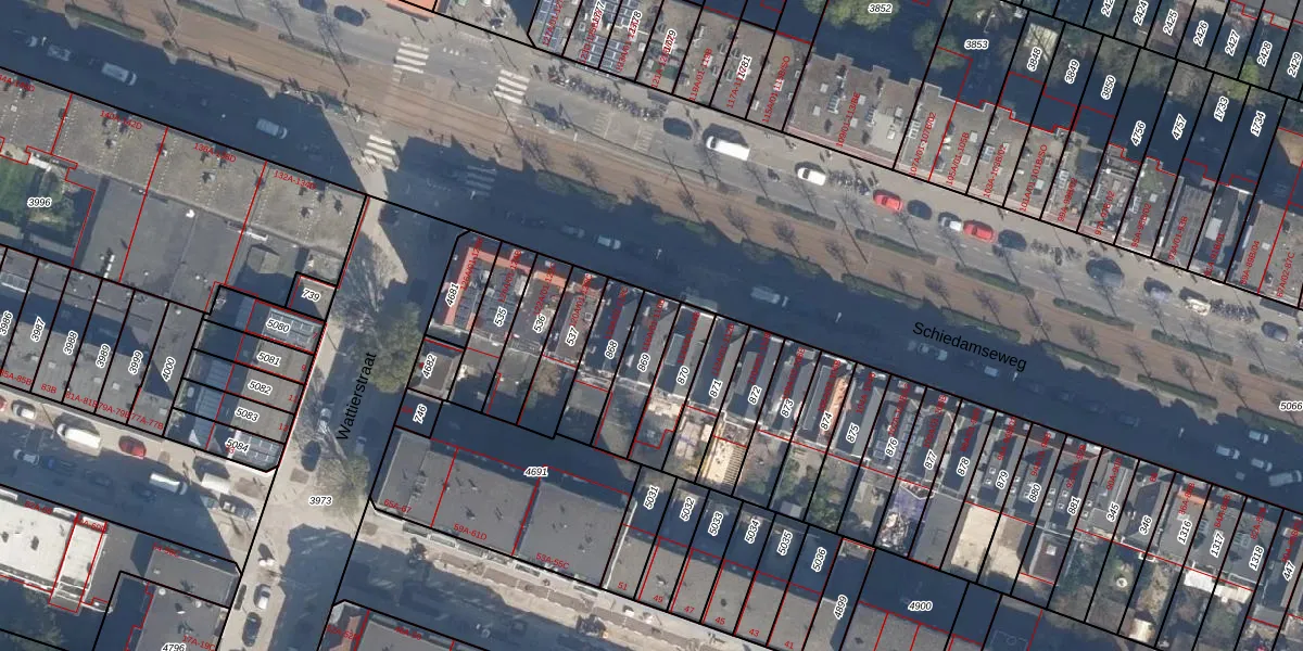 Schiedamseweg 116-B is gelegen op kadastraal perceel DHV00H869. Deze kadastrale aanduiding is uniek en wordt gebruikt door het Kadaster om eigendomsrechten en andere zakelijke rechten vast te leggen. Het perceel maakt onderdeel uit van de kadastrale gemeente Delfshaven.