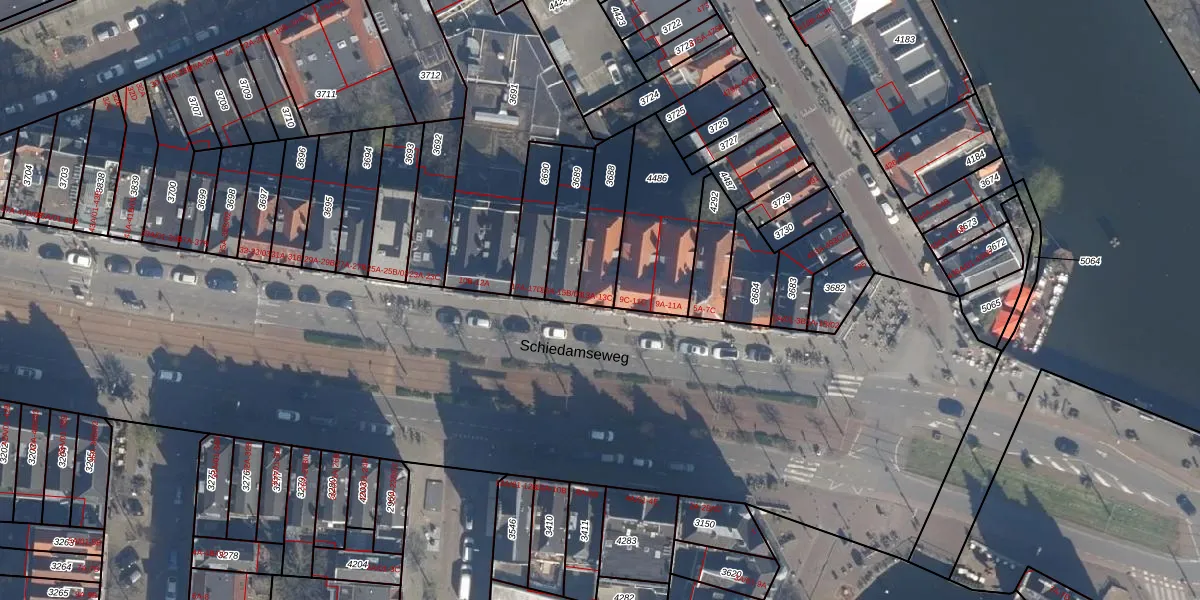Schiedamseweg 13-A is gelegen op kadastraal perceel DHV00H3688. Deze kadastrale aanduiding is uniek en wordt gebruikt door het Kadaster om eigendomsrechten en andere zakelijke rechten vast te leggen. Het perceel maakt onderdeel uit van de kadastrale gemeente Delfshaven.