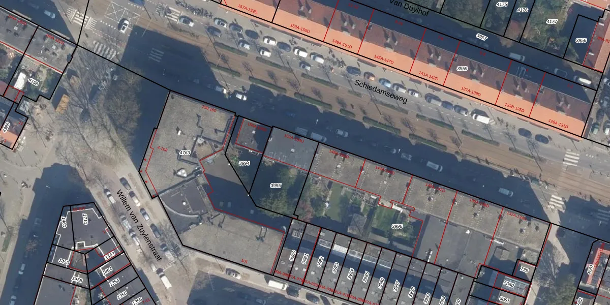 Schiedamseweg 152-A is gelegen op kadastraal perceel DHV00H3995. Deze kadastrale aanduiding is uniek en wordt gebruikt door het Kadaster om eigendomsrechten en andere zakelijke rechten vast te leggen. Het perceel maakt onderdeel uit van de kadastrale gemeente Delfshaven.