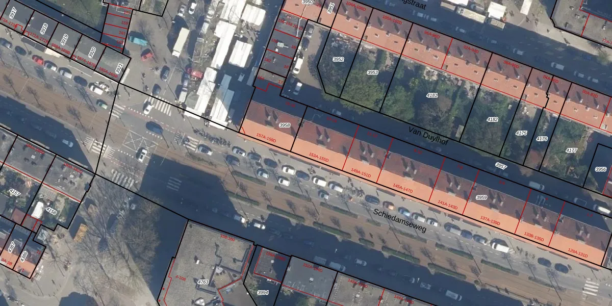 Schiedamseweg 155-D is gelegen op kadastraal perceel DHV00H3959. Deze kadastrale aanduiding is uniek en wordt gebruikt door het Kadaster om eigendomsrechten en andere zakelijke rechten vast te leggen. Het perceel maakt onderdeel uit van de kadastrale gemeente Delfshaven.