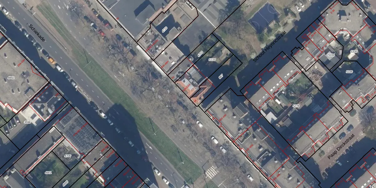 Het perceel waarop Schiekade 52-G staat heeft een oppervlakte van 360 m². Dit is een groot perceel. De perceeloppervlakte wordt geregistreerd door het Kadaster. Gedetailleerde informatie over de maten van dit perceel kunt u vinden in het rapport Kadastrale kaart met maatvoering van Schiekade 52-G.