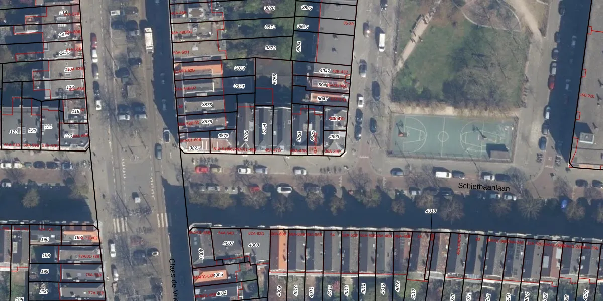 Schietbaanlaan 43-A is gelegen op kadastraal perceel DHV00C3881. Deze kadastrale aanduiding is uniek en wordt gebruikt door het Kadaster om eigendomsrechten en andere zakelijke rechten vast te leggen. Het perceel maakt onderdeel uit van de kadastrale gemeente Delfshaven.