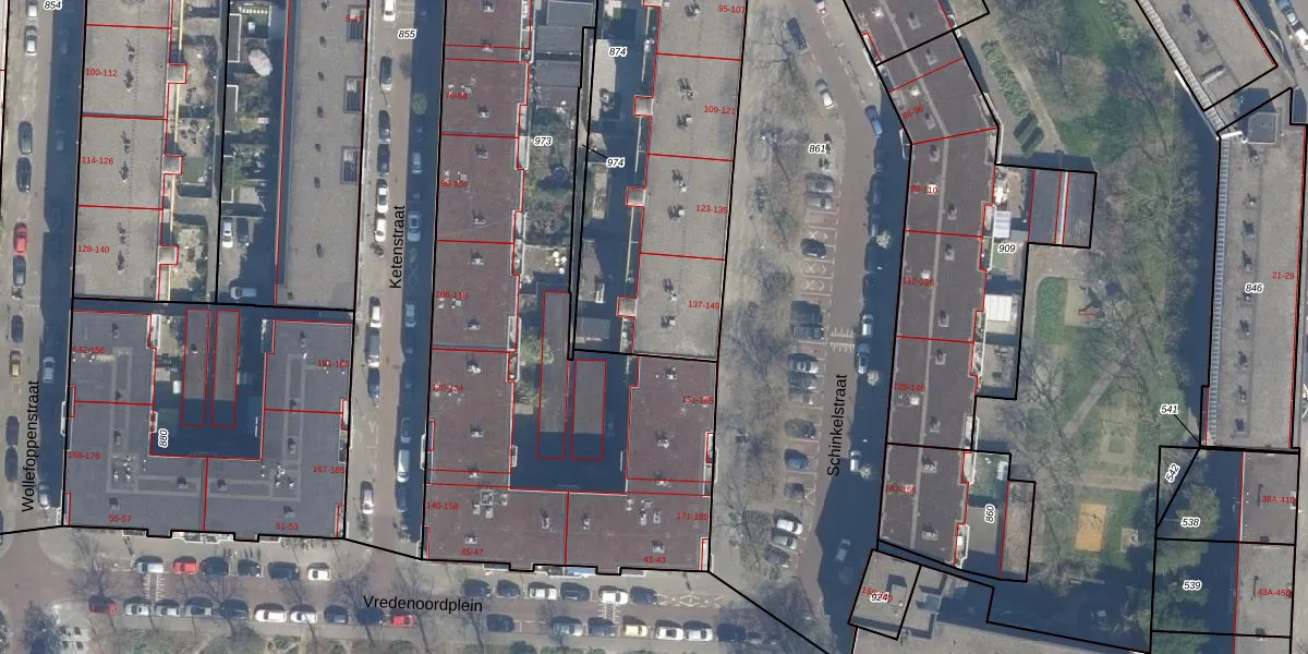Het adres is gelegen op perceel 874 in de sectie AE en de kadastrale gemeente Rotterdam. De kadastrale aanduiding is aldus RTD04-AE-874. Het perceel is met 2350 m² relatief groot. Het gemiddelde ligt in de kadastrale gemeente Rotterdam op 1239,97 m². Het kleinste perceel in de kadastrale gemeente is 0 m² groot. De grootste perceeloppervlakte is 17,3 ha. Op het perceel liggen in totaal 49 adressen. In de Basisregistratie Kadaster (BRK) werden de grenzen van het perceel geregistreerd op 24-01-2003.