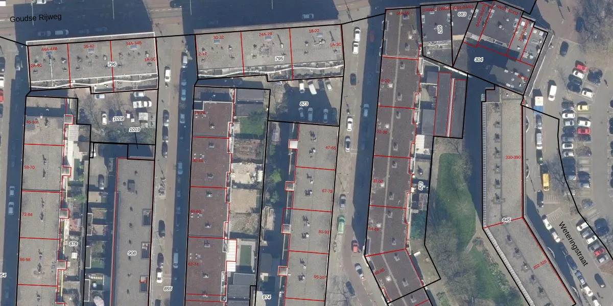 Het adres is gelegen op perceel 874 in de sectie AE en de kadastrale gemeente Rotterdam. De kadastrale aanduiding is aldus RTD04-AE-874. Het perceel is met 2350 m² relatief groot. Het gemiddelde ligt in de kadastrale gemeente Rotterdam op 1239,97 m². Het grootste perceel in de kadastrale gemeente is 17,3 ha. Het kleinste perceel heeft een oppervlakte van 0 m². Er zijn 49 adressen aanwezig op het perceel. De laatste wijziging in het de Basisregistratie Kadaster (BRK) was op 24-01-2003.