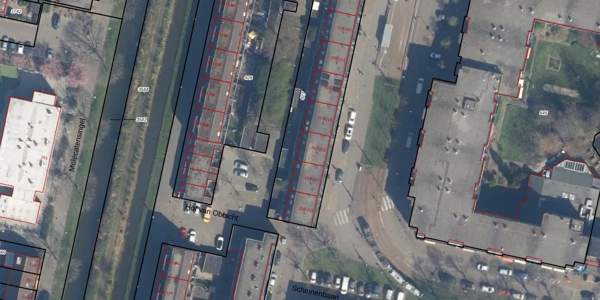 Het perceel waarop Schinnenbaan 221 staat heeft een oppervlakte van 1541 m². Dit is een zeer groot perceel. De perceeloppervlakte wordt geregistreerd door het Kadaster. Gedetailleerde informatie over de maten van dit perceel kunt u vinden in het rapport Kadastrale kaart met maatvoering van Schinnenbaan 221.
