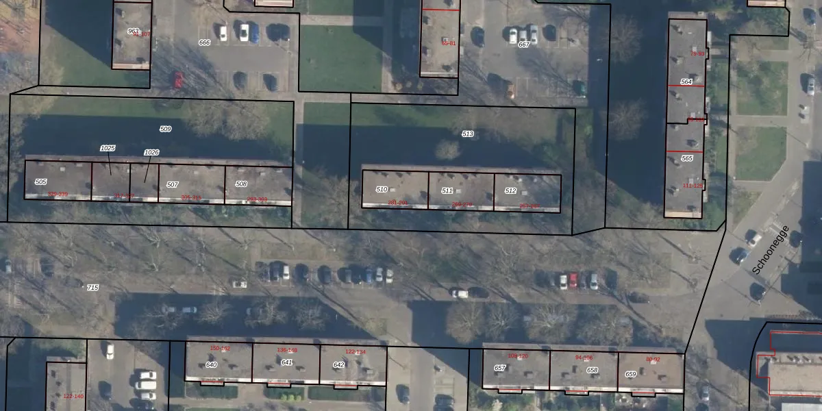 Schoonegge 287 is gelegen op kadastraal perceel CLS00K510. Deze kadastrale aanduiding is uniek en wordt gebruikt door het Kadaster om eigendomsrechten en andere zakelijke rechten vast te leggen. Het perceel maakt onderdeel uit van de kadastrale gemeente Charlois.