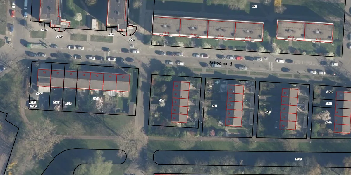 Schoonveld 32 is gelegen op kadastraal perceel CLS00K443. Deze kadastrale aanduiding is uniek en wordt gebruikt door het Kadaster om eigendomsrechten en andere zakelijke rechten vast te leggen. Het perceel maakt onderdeel uit van de kadastrale gemeente Charlois.