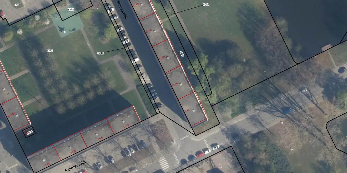 Het perceel waarop Schoordijk 25 staat heeft een oppervlakte van 1696 m². Dit is een zeer groot perceel. De perceeloppervlakte wordt geregistreerd door het Kadaster. Gedetailleerde informatie over de maten van dit perceel kunt u vinden in het rapport Kadastrale kaart met maatvoering van Schoordijk 25.
