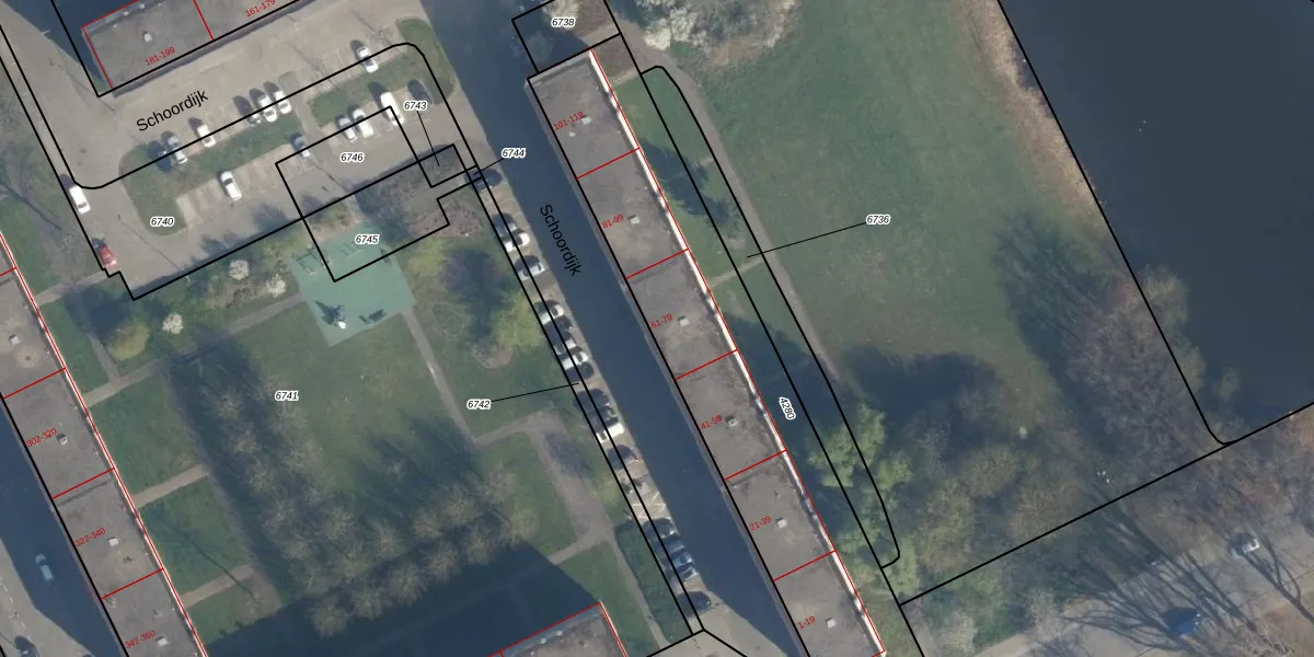 Het perceel waarop Schoordijk 67 staat heeft een oppervlakte van 1696 m². Dit is een zeer groot perceel. De perceeloppervlakte wordt geregistreerd door het Kadaster. Gedetailleerde informatie over de maten van dit perceel kunt u vinden in het rapport Kadastrale kaart met maatvoering van Schoordijk 67.