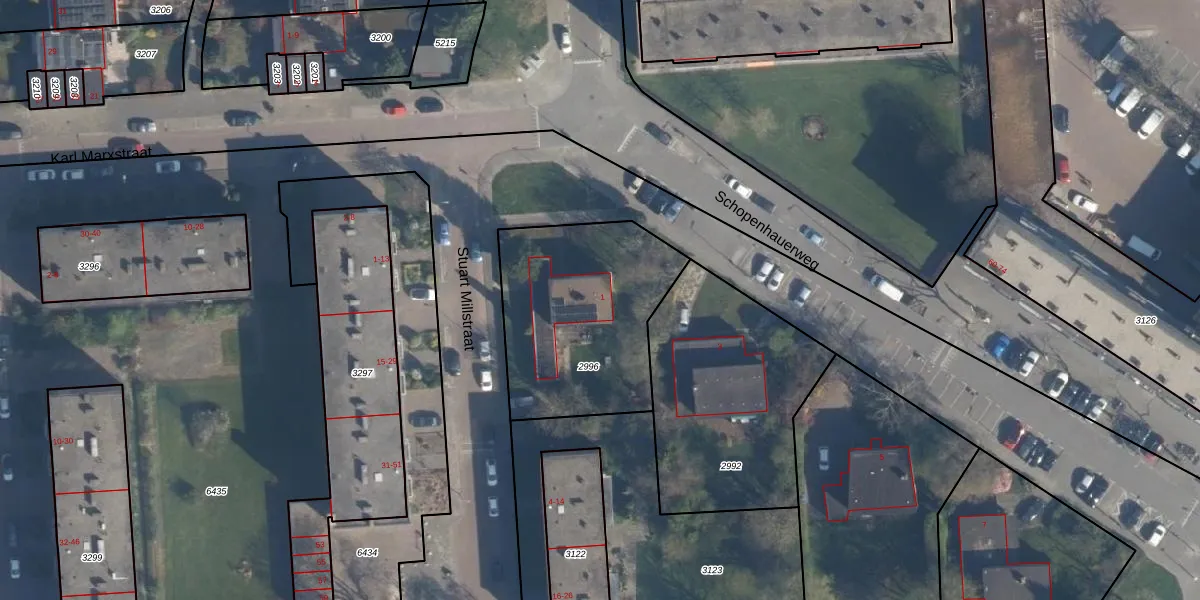 Gebruik de zoekbalk of klik op een perceel voor informatie over de adressen binnen dit perceel.