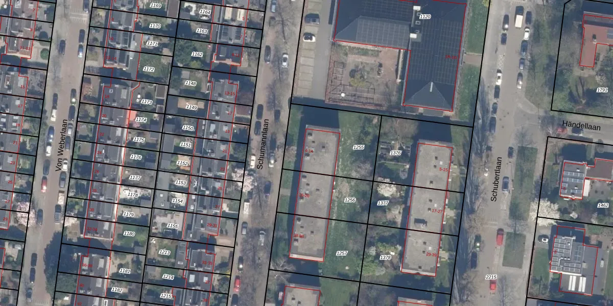 Het perceel waarop Schumannlaan 12 staat heeft een oppervlakte van 653 m². Dit is een groot perceel. De perceeloppervlakte wordt geregistreerd door het Kadaster. Gedetailleerde informatie over de maten van dit perceel kunt u vinden in het rapport Kadastrale kaart met maatvoering van Schumannlaan 12.