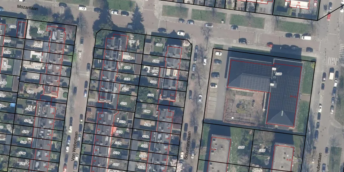Het perceel waarop Schumannlaan 7 staat heeft een oppervlakte van 174 m². Dit is een middelgroot perceel. De perceeloppervlakte wordt geregistreerd door het Kadaster. Gedetailleerde informatie over de maten van dit perceel kunt u vinden in het rapport Kadastrale kaart met maatvoering van Schumannlaan 7.