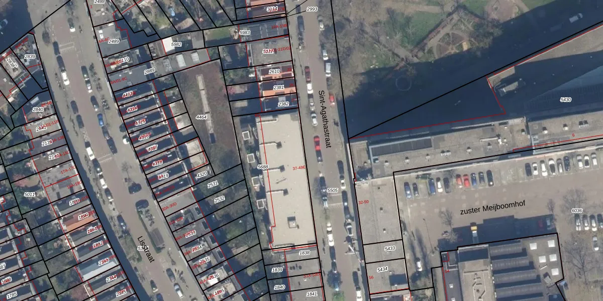 Het perceel waarop Sint-Agathastraat 39 staat heeft een oppervlakte van 928 m². Dit is een groot perceel. De perceeloppervlakte wordt geregistreerd door het Kadaster. Gedetailleerde informatie over de maten van dit perceel kunt u vinden in het rapport Kadastrale kaart met maatvoering van Sint-Agathastraat 39.