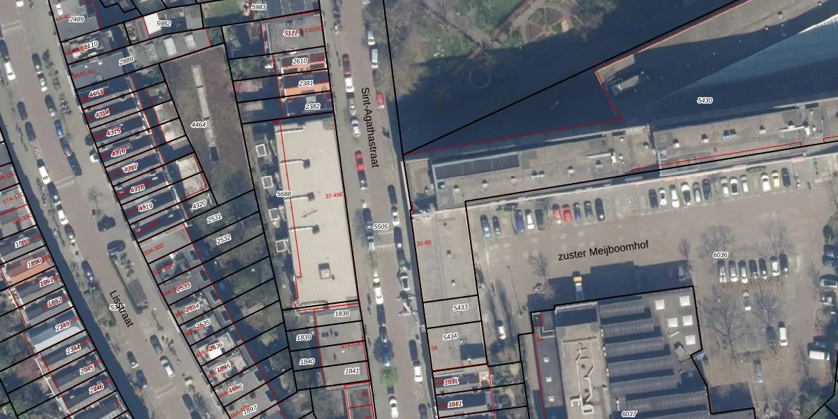 Het perceel waarop Sint-Agathastraat 48 staat heeft een oppervlakte van 5693 m². Dit is een zeer groot perceel. De perceeloppervlakte wordt geregistreerd door het Kadaster. Gedetailleerde informatie over de maten van dit perceel kunt u vinden in het rapport Kadastrale kaart met maatvoering van Sint-Agathastraat 48.