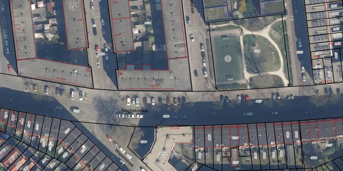 Slaghekstraat 181-F is gelegen op kadastraal perceel CLS00G5579. Deze kadastrale aanduiding is uniek en wordt gebruikt door het Kadaster om eigendomsrechten en andere zakelijke rechten vast te leggen. Het perceel maakt onderdeel uit van de kadastrale gemeente Charlois.
