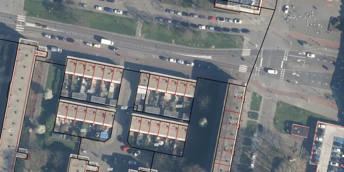 Slinge 264 is gelegen op kadastraal perceel CLS00L2690. Deze kadastrale aanduiding is uniek en wordt gebruikt door het Kadaster om eigendomsrechten en andere zakelijke rechten vast te leggen. Het perceel maakt onderdeel uit van de kadastrale gemeente Charlois.