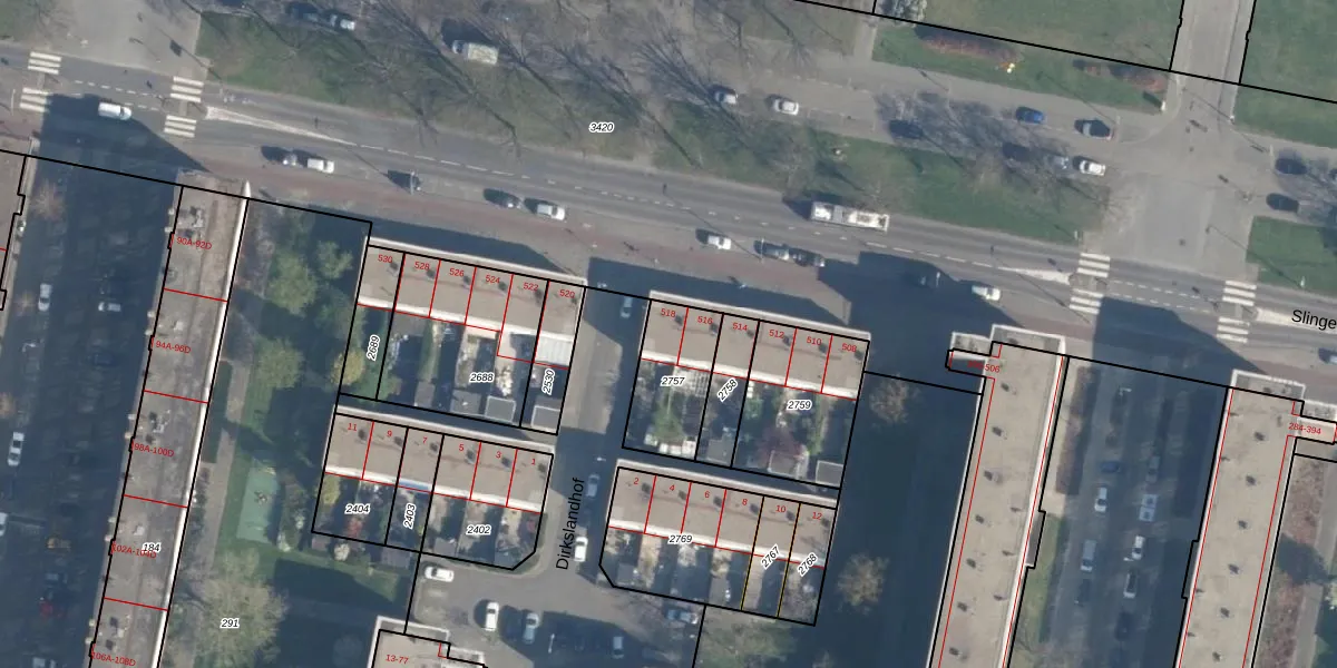Slinge 518 is gelegen op kadastraal perceel CLS00L2757. Deze kadastrale aanduiding is uniek en wordt gebruikt door het Kadaster om eigendomsrechten en andere zakelijke rechten vast te leggen. Het perceel maakt onderdeel uit van de kadastrale gemeente Charlois.