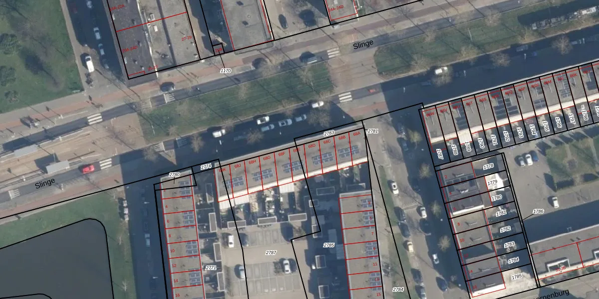 Slinge 68-E is gelegen op kadastraal perceel CLS00K2785. Deze kadastrale aanduiding is uniek en wordt gebruikt door het Kadaster om eigendomsrechten en andere zakelijke rechten vast te leggen. Het perceel maakt onderdeel uit van de kadastrale gemeente Charlois.